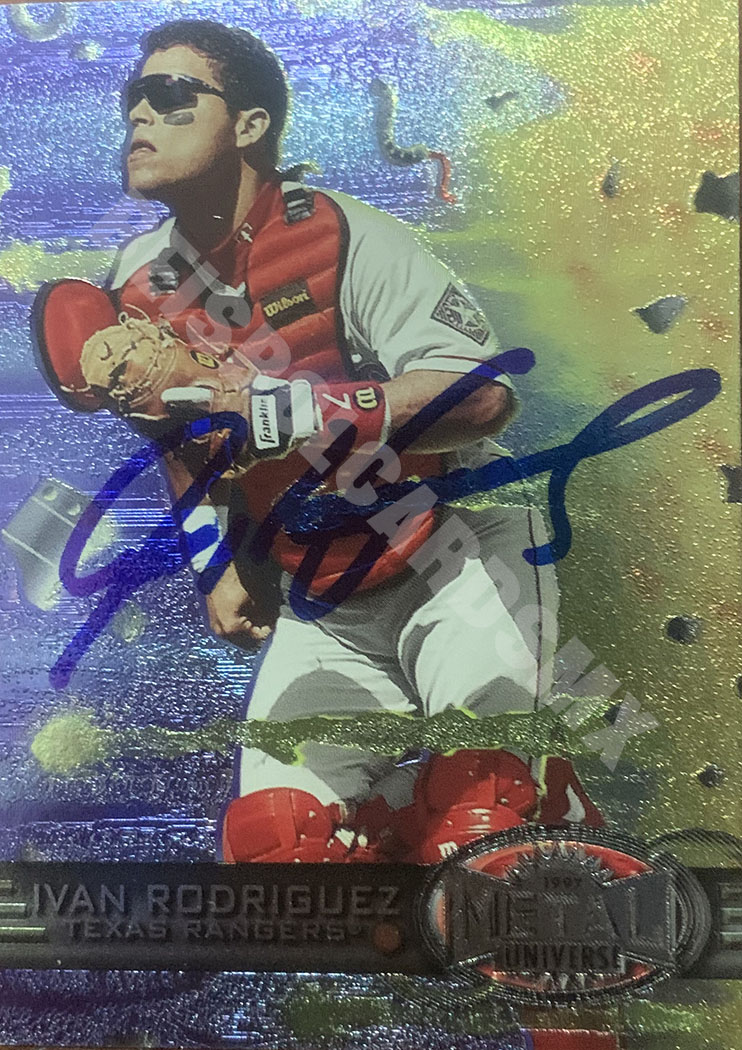 Tarjeta firmada coleccionable de béisbol Fleer/Skybox Metal Universe de 1997 presenta al legendario receptor Iván Rodríguez, número 168, en tamaño estándar. Es una tarjeta original del set base y no esta certificada